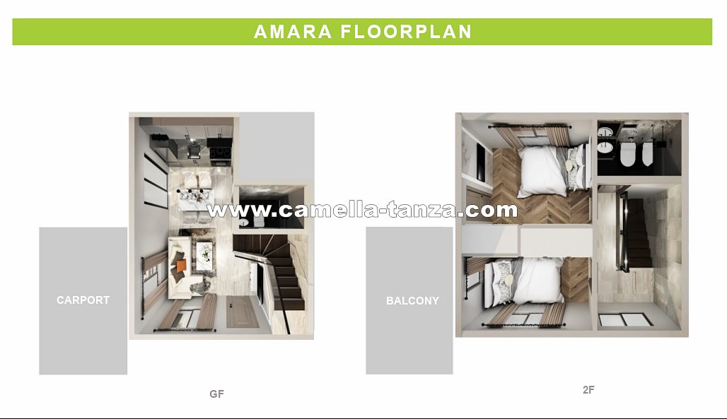 Amara has a lot area of 88 sqm and a house area of 52 sqm (or 72 sqm with balcony option). It's a single attached 2-storey house with two bedrooms, two toilets and baths, a living area, dining area, kitchen, a carport, provision for a balcony, and a laundry and service area. The grand master's bedroom is located at the second floor with exclusive toilet and bathroom. If you want the biggest space and all the extra rooms that you can have, Amara model is for you!
